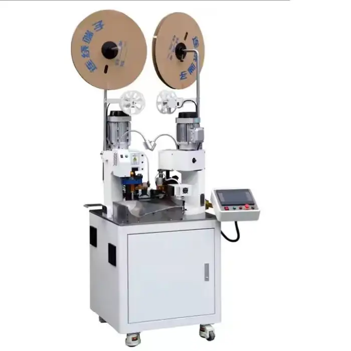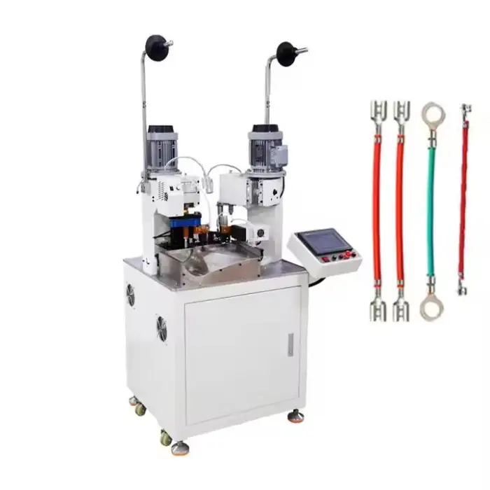 The machine performs cutting, stripping, and terminal crimping, along with handling double wear waterproof bolts.