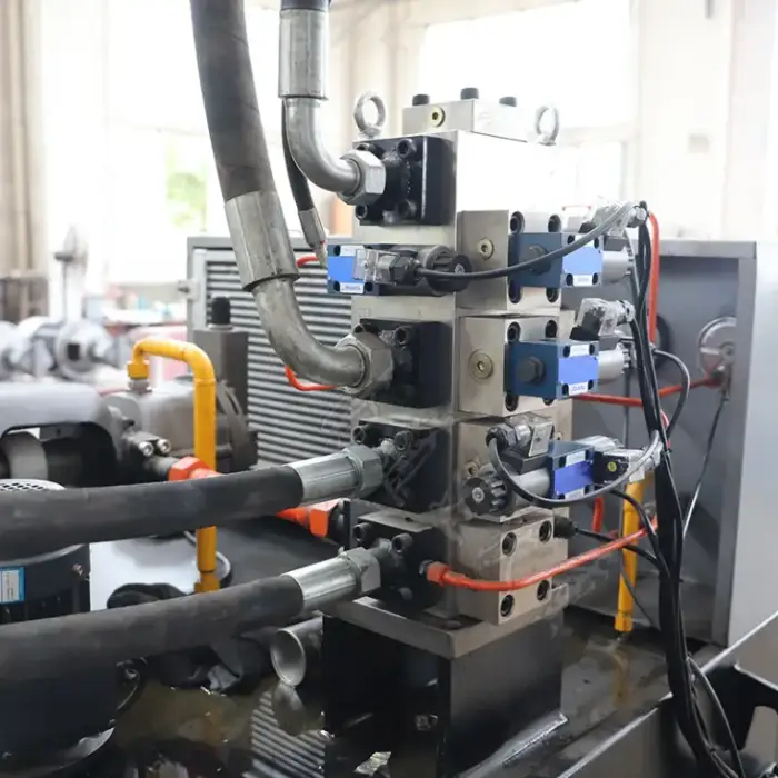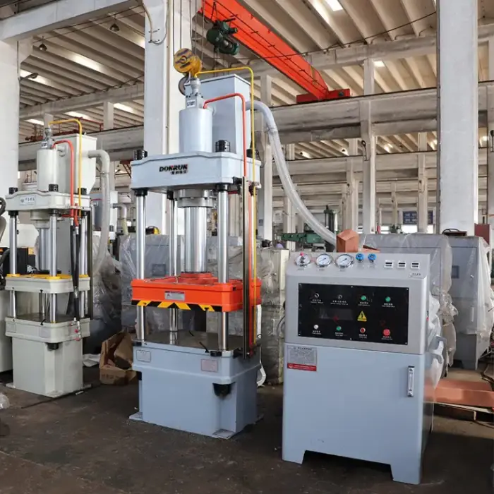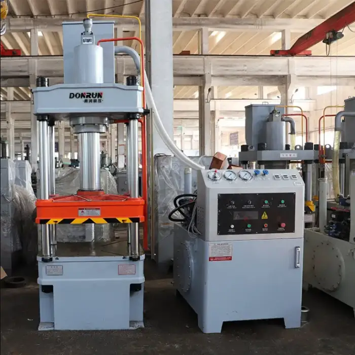 This hydraulic press can work with various materials, including sheet metal and other metal components.