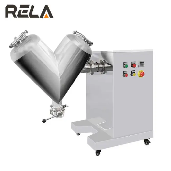 The Small V Type Powder Mixer Machine includes safety features such as a secure locking mechanism and user-friendly controls to ensure safe operation.
