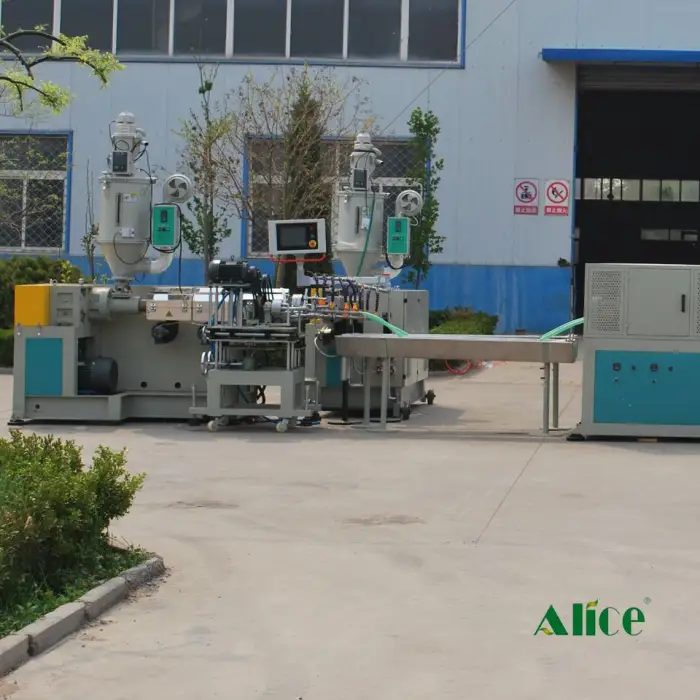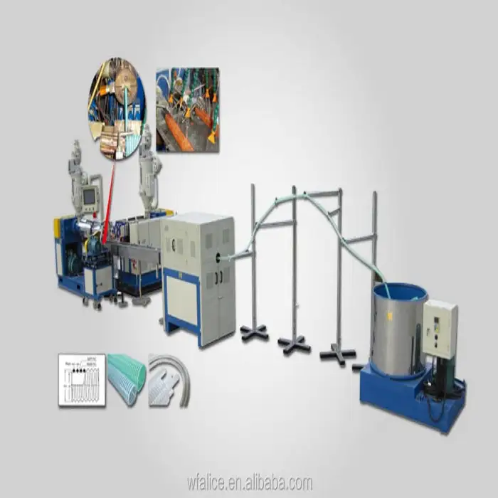 The machine is designed for producing PVC hoses reinforced with steel wire, ensuring durability and flexibility.