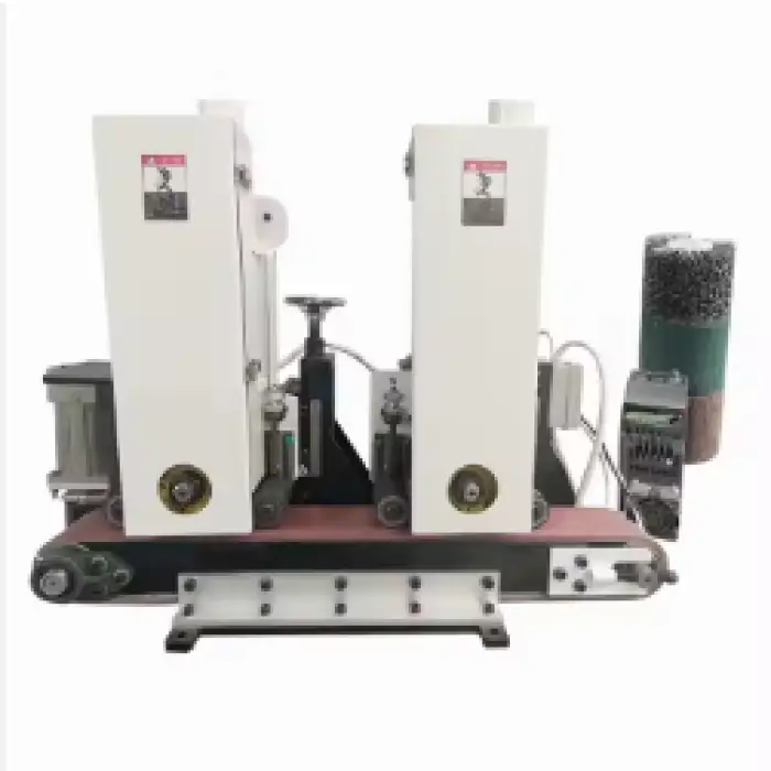 The machine uses sand belts and flap wheels, as well as scotch brite wheels for various polishing effects.