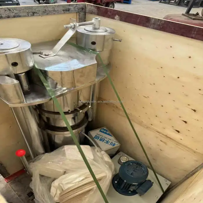 The hydraulic system in this oil press applies high pressure to seeds and nuts to extract oil efficiently, ensuring maximum yield.