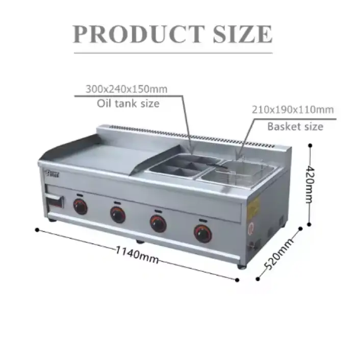 The dimensions of the griddle fryer are L730 mm x W400 mm x H10 mm.