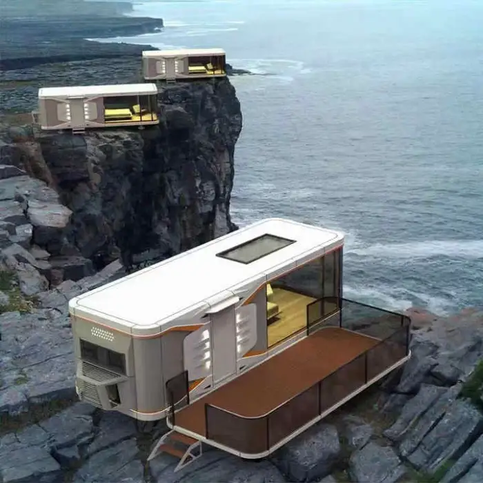 The cabin is designed in a postmodern style, combining aesthetics with functionality.
