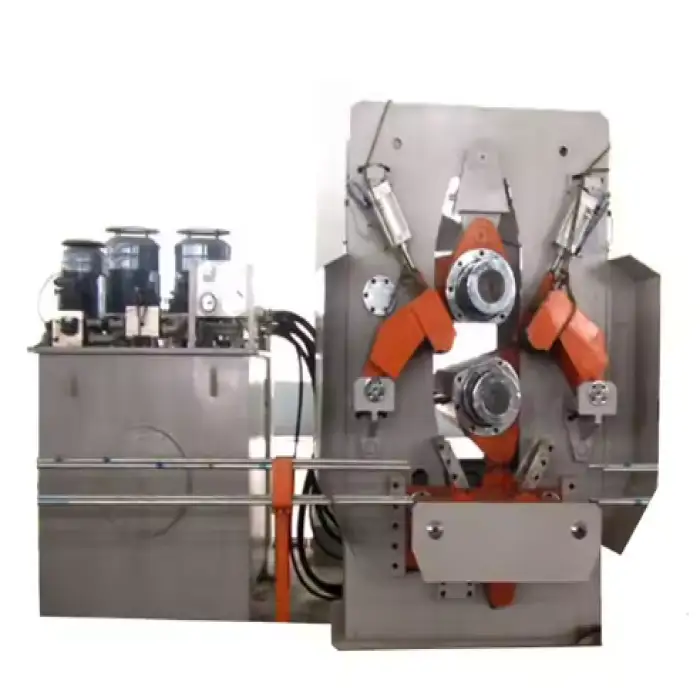 The machine is designed to work with steel, specifically for manufacturing steel rims for tractors and heavy vehicles.