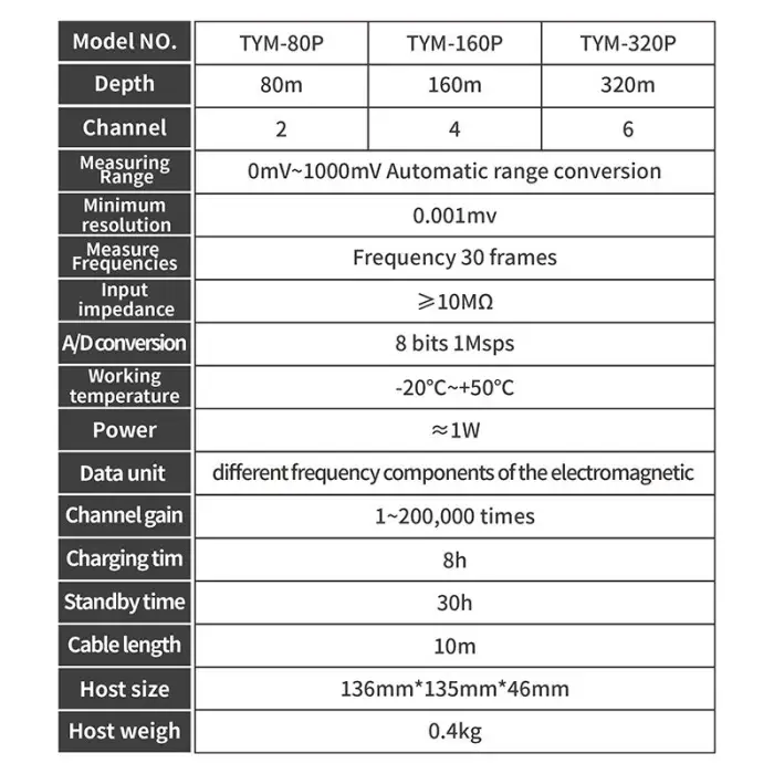 The TYM Borehole Drilling Water Detector is available in three models: TYM-80P, TYM-160P, and TYM-320P, each with different detection depths.