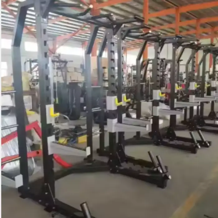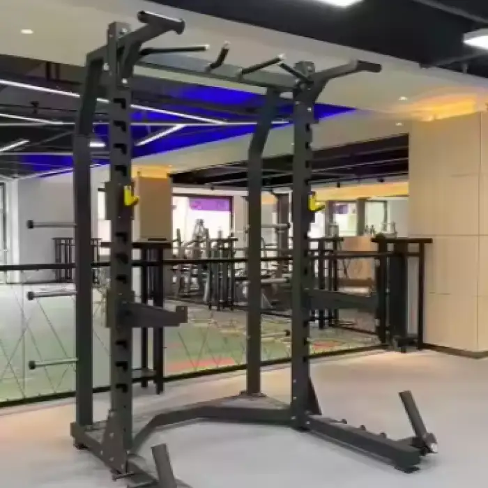 The machine supports various exercises, including bench presses, squats, and other strength training moves, making it a multi-functional piece of equipment.