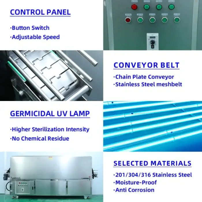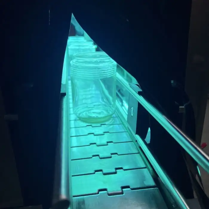 The UV Sterilizer Tunnel Machine is designed to efficiently disinfect empty glass and plastic bottles, jars, and cans.