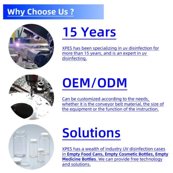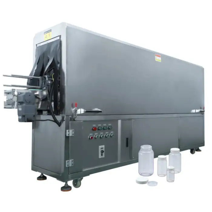 The machine uses powerful UV light to eliminate harmful bacteria and viruses on the surfaces of containers, ensuring thorough sterilization.