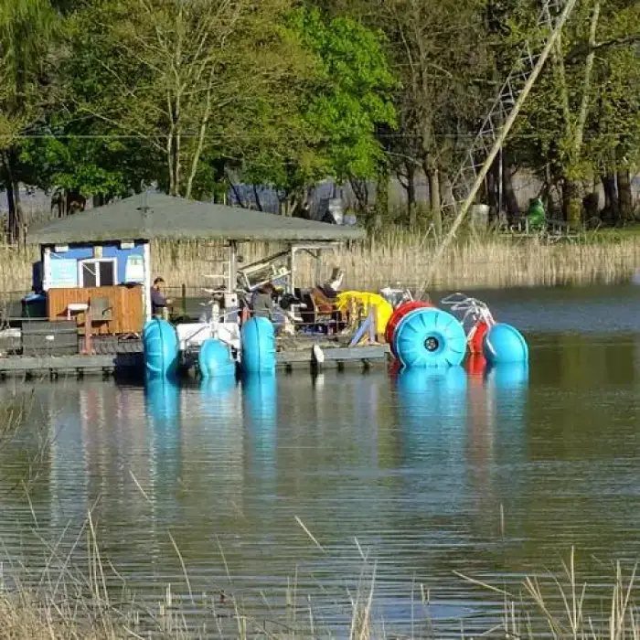 The Water Bike is powered by pedaling with your feet, providing a fun and engaging way to move across the water.
