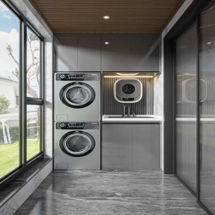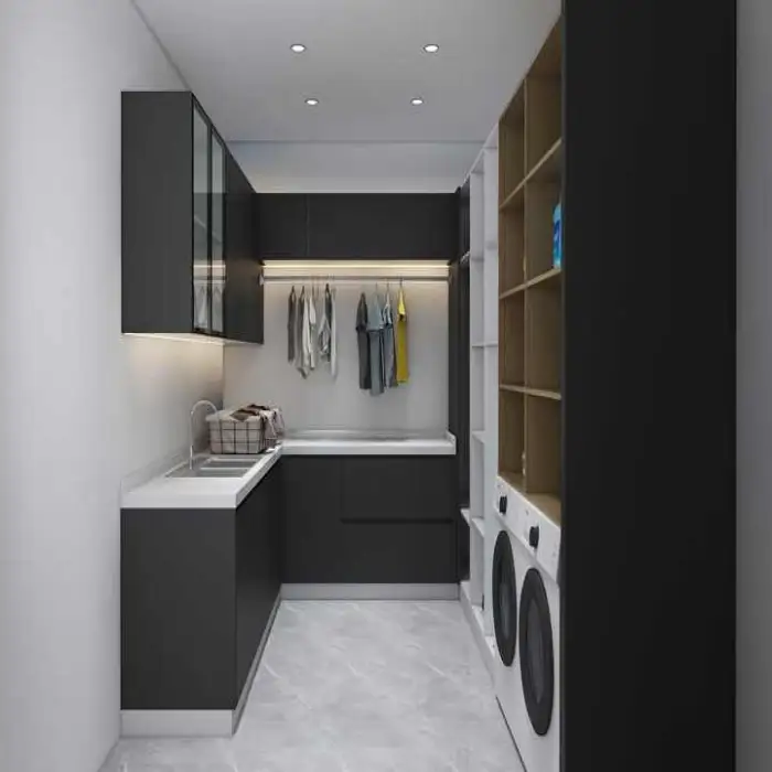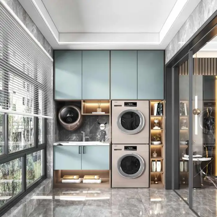 The cabinet has a modern design style that fits seamlessly into contemporary laundry rooms.