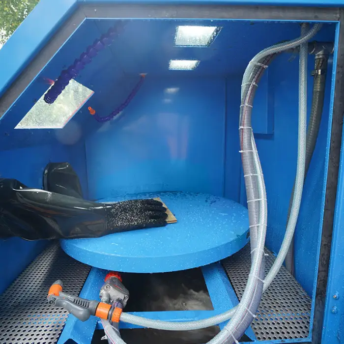 While primarily designed for metal parts, the machine may also be used on other surfaces compatible with wet blasting, but it is advisable to test on a small area first.
