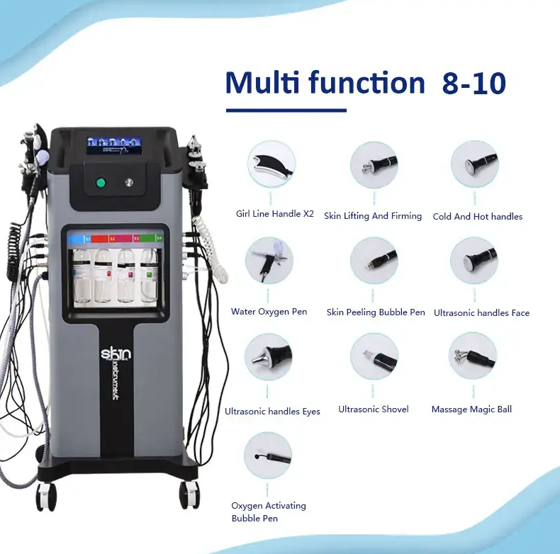 The machine includes 10 functionalities such as Diamond Dermabrasion, Vacuum Therapy, Ultrasonic treatment, anti-aging treatments, pigmentation and whitening, pore refining, and eye care.