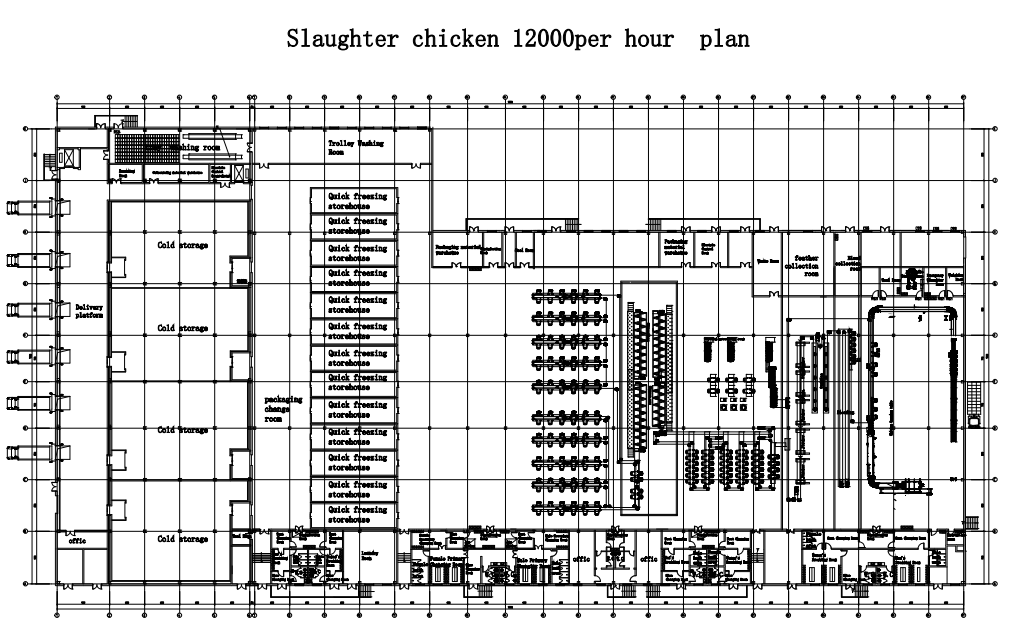 The production capacity of the 12 000BPH Meat Processing Line ranges from 500 to 12,000 birds per hour.