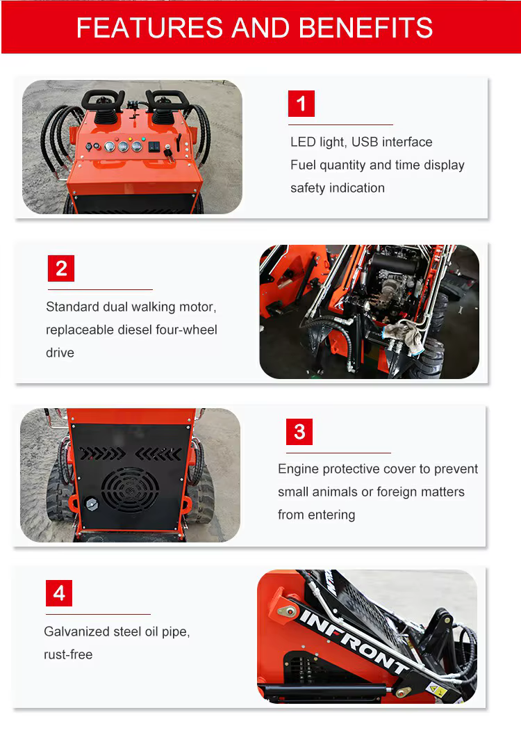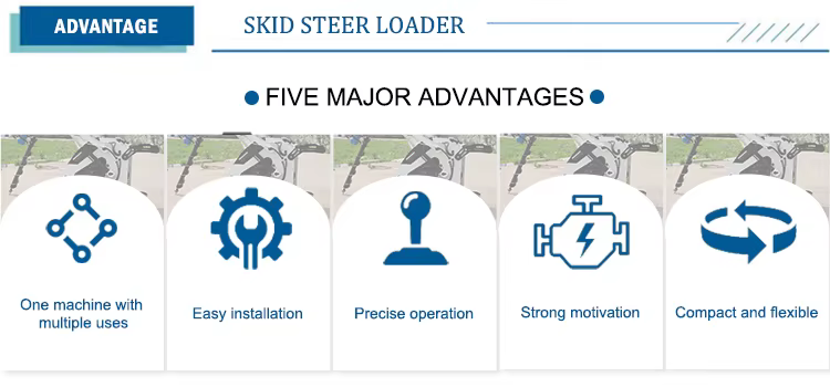 This skid steer loader is suitable for a variety of tasks including landscaping, construction material handling, excavation, and loading or unloading materials.