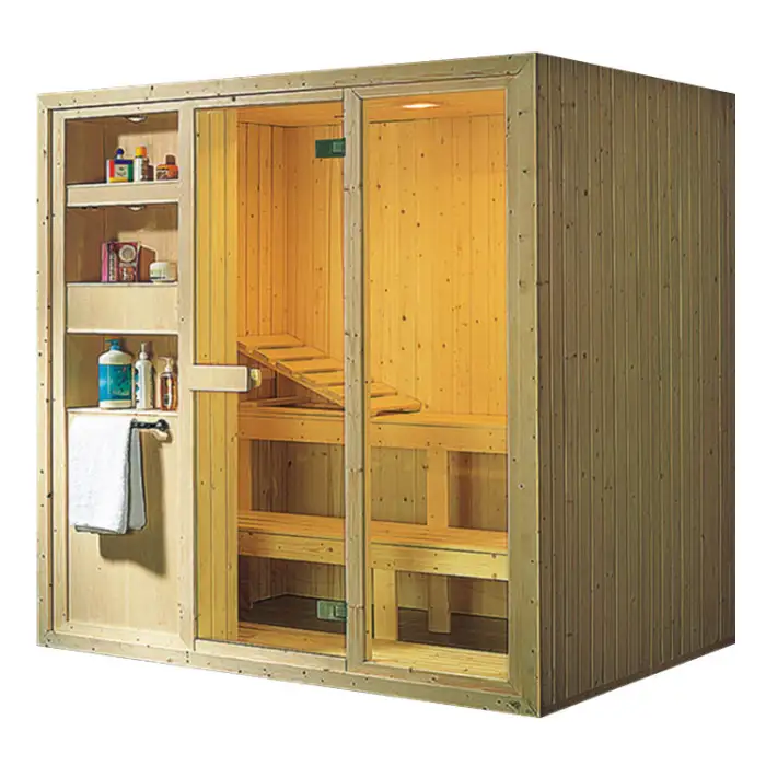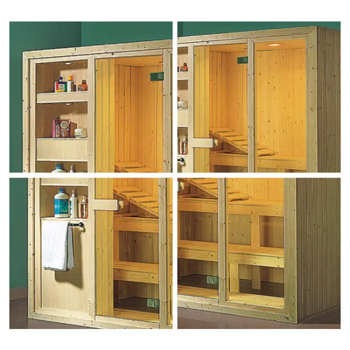 The sauna is constructed from high-quality solid wood, ensuring durability and a modern aesthetic.