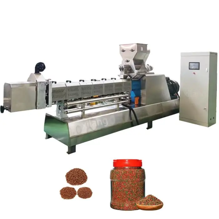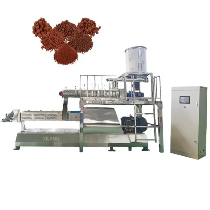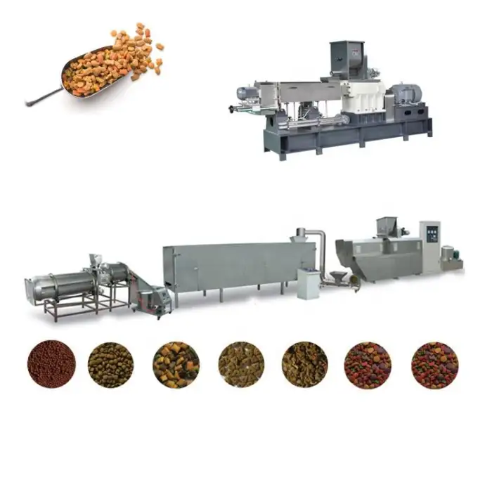 The machine utilizes internationally advanced twin screw extrusion technology for efficient and high-quality pet food production.