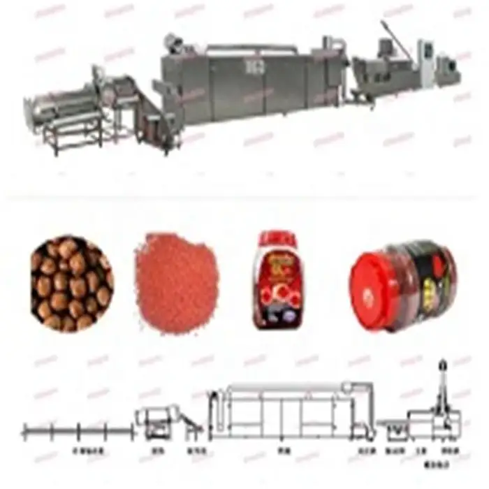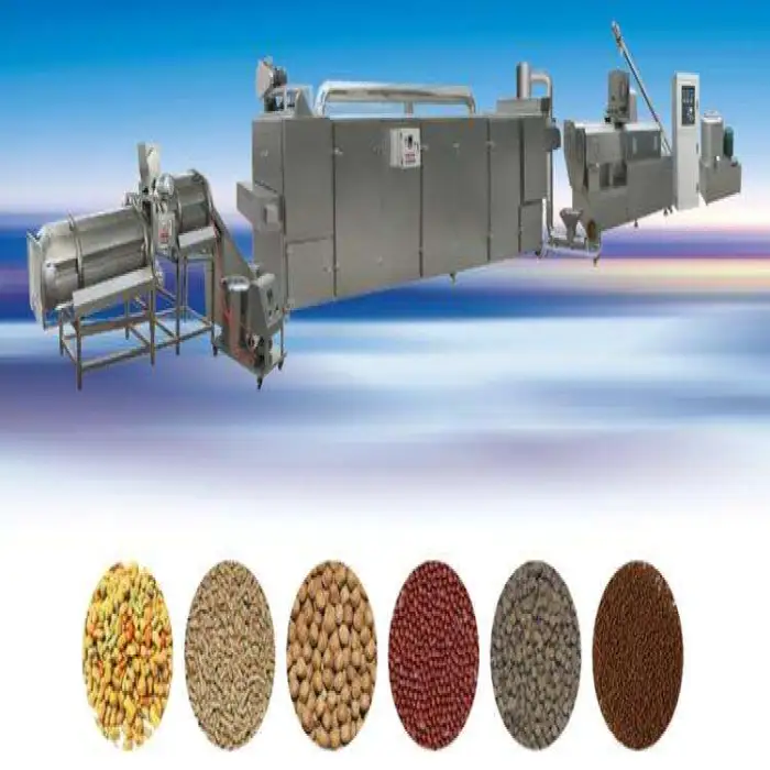 This machine is designed to produce various types of pet foods, including dog food, cat food, chicken feed, fish feed, and shrimp feed.