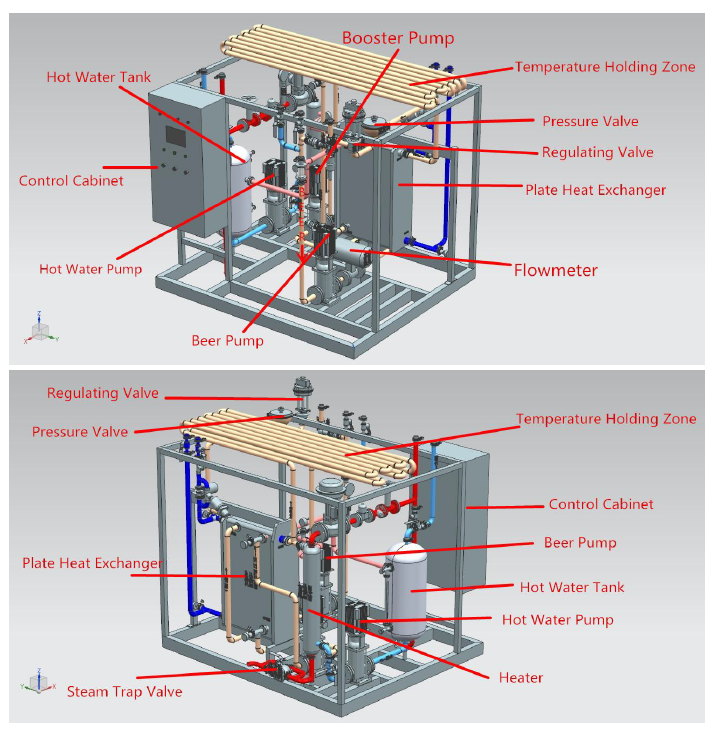A beer flash pasteurizer is a machine designed to rapidly heat beer to a specific temperature and then quickly cool it down, effectively killing harmful microorganisms while preserving flavor and quality.