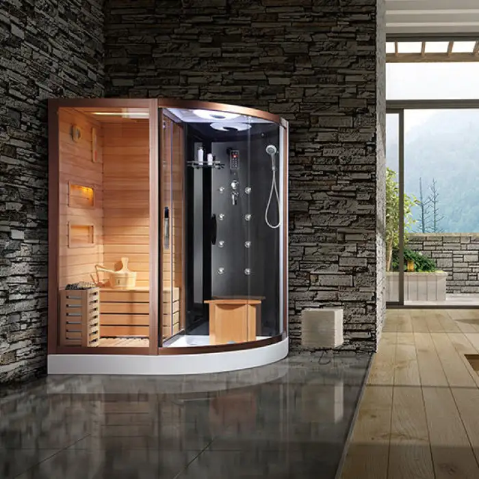 The sauna features a durable wooden construction, providing a natural feel.