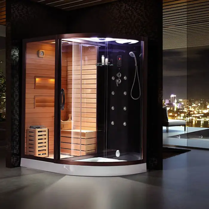 The sauna offers a dry steam experience and far infrared sauna options.