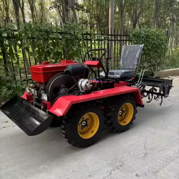 The tractor comes with six essential farm tools: a soil shovel, rotary tiller, ditching machine, backfilling machine, front loader, and trailer.