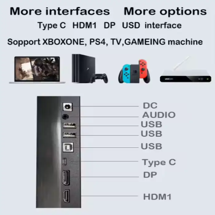 The monitor includes multiple connection options: D-SUB, HDMI, DP, Type C, and USB.