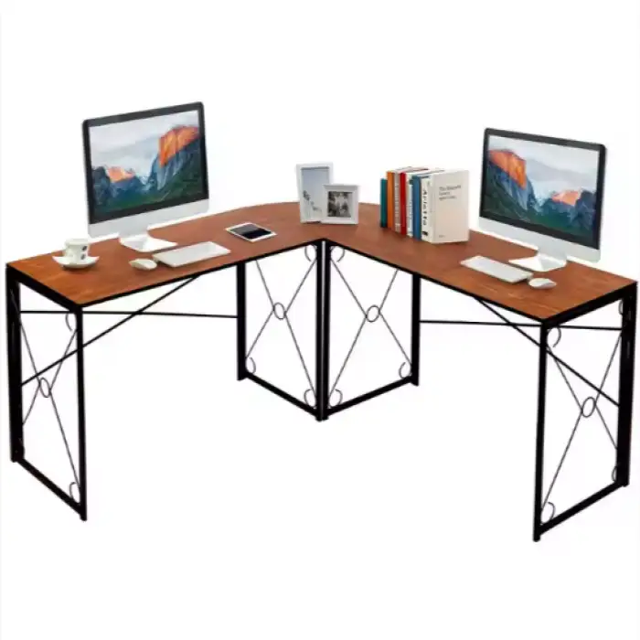The desk features a large surface area that accommodates laptops, monitors, and gaming accessories.