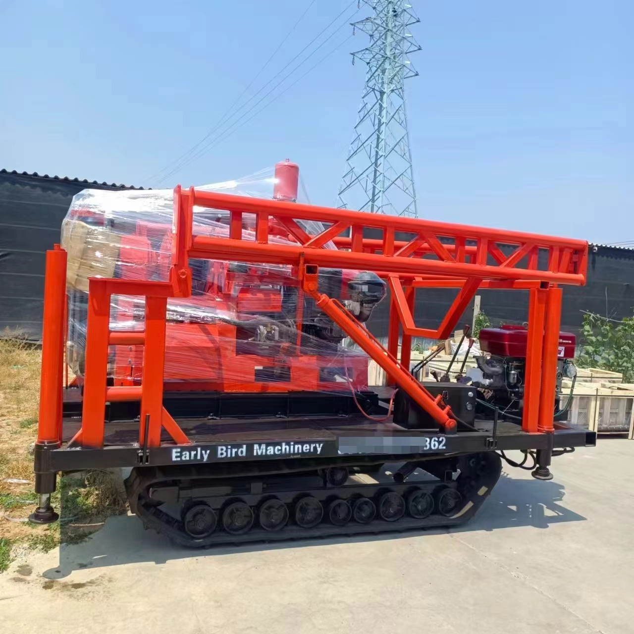 "WITHOUT CRAWLER" indicates this drilling rig does not come with crawler tracks. It is a skid/standalone unit designed for transport by truck or trailer. If you need tracked mobility, please inquire about an optional crawler-mounted version or transport/mobility accessories.