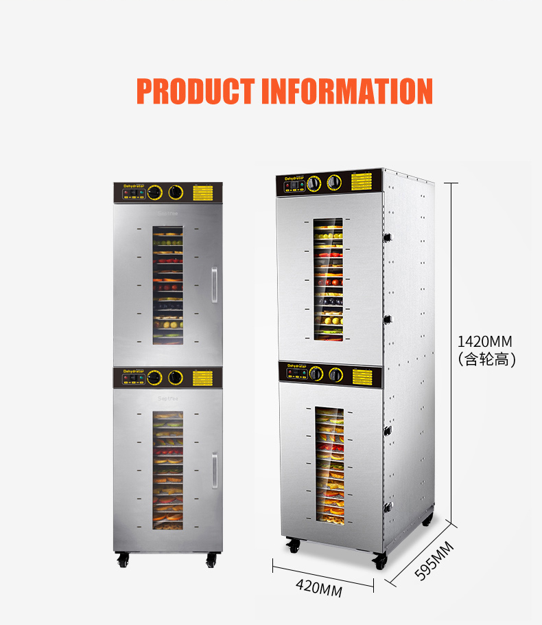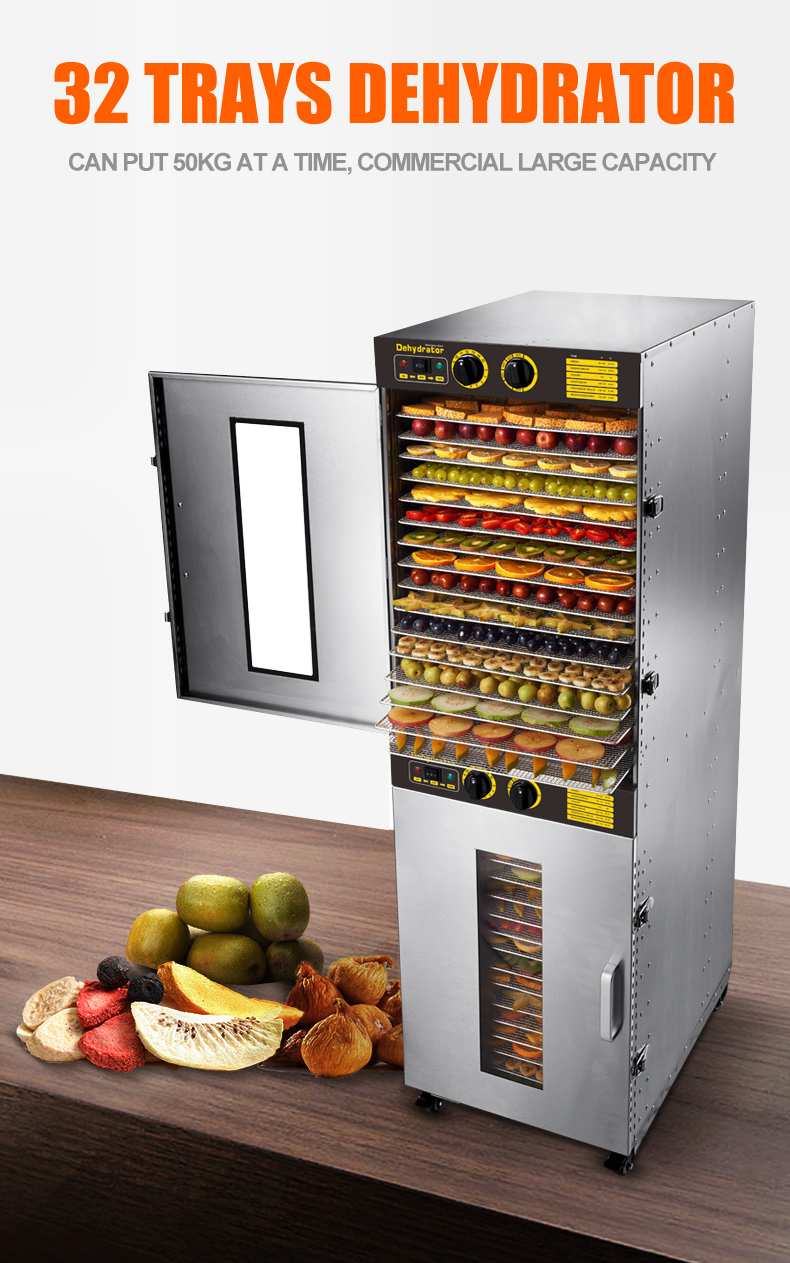 The dehydrator has 32 trays and a net capacity of about 220 L. Typical load capacity is 40–55 kg per batch depending on the product being dried.
