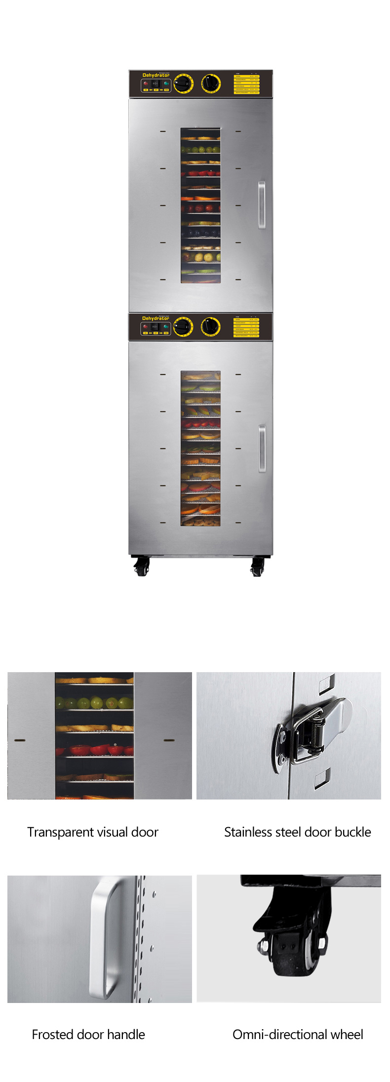 Trays are food-grade 304 stainless steel. Housing, handles and latches are 201 stainless steel. The door has tempered glass and an aluminum alloy door handle.