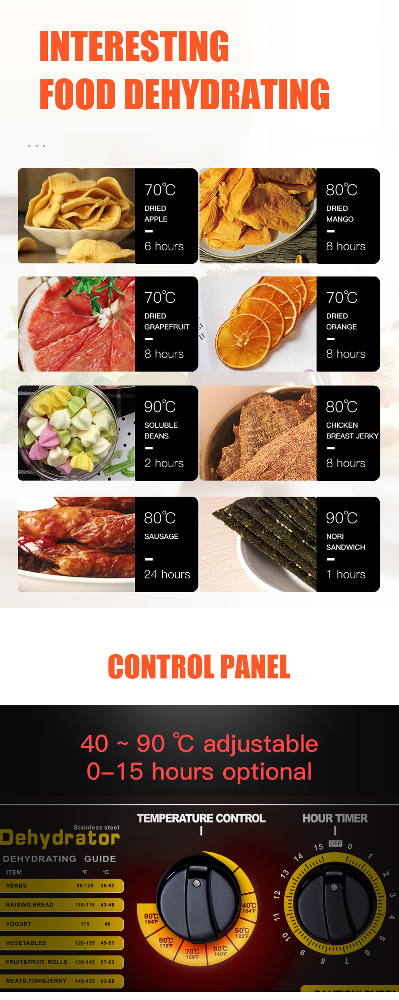 Temperature range: 40–90 °C (104–194 °F). Timer: 0–15 hours with a normal open (automatic stop) function.