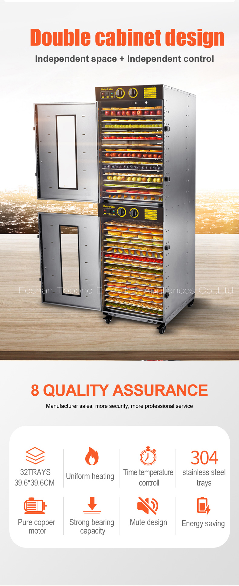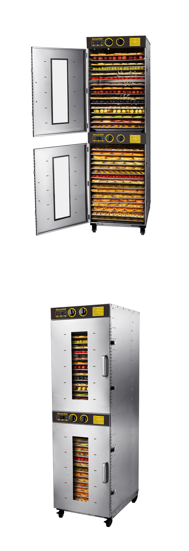 Each cabinet uses 2 motors + 2 fans (so 4 motors and 4 fans total for the two-cabinet unit). This improves airflow uniformity for better drying effect and higher efficiency.