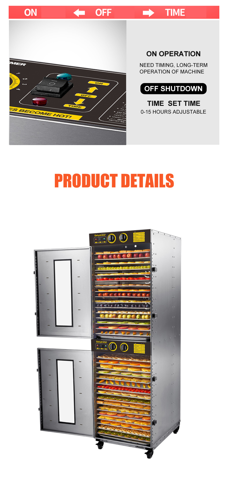 The unit uses simple mechanical knobs for easy operation. It features two independently controlled cabinets so temperature and time can be set separately for each cabinet.
