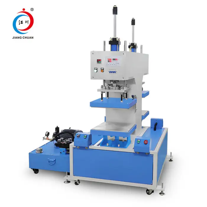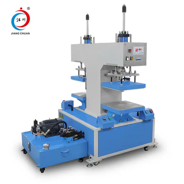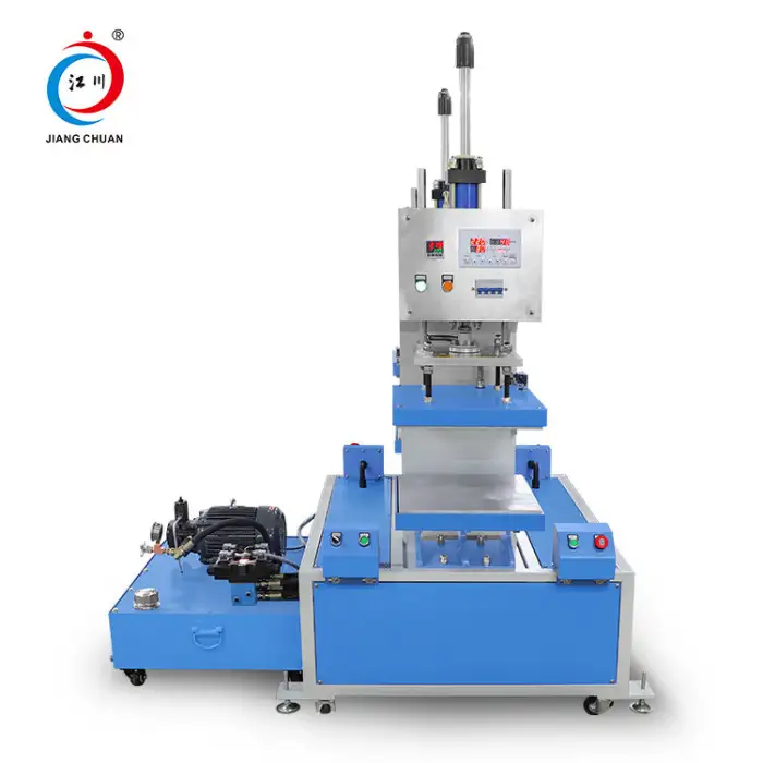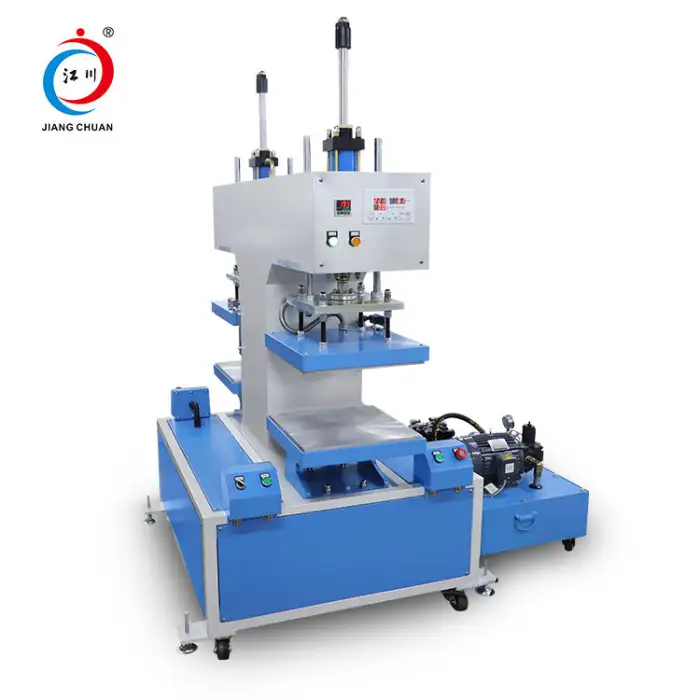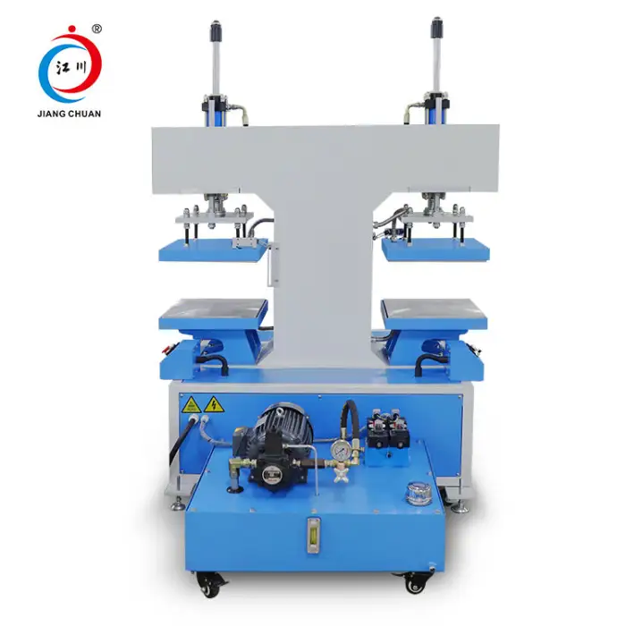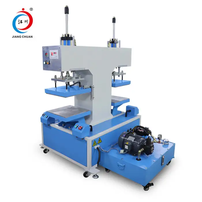 The machine is hydraulically driven, which allows for efficient and consistent pressure during the printing process.