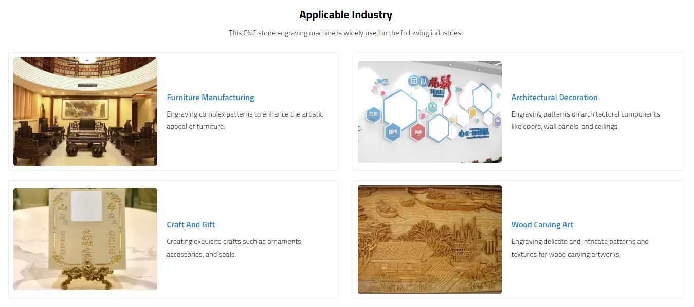 The CNC router is suitable for applications such as furniture manufacturing, custom cabinetry, sign making, 3D modeling, engraving, and prototype creation.