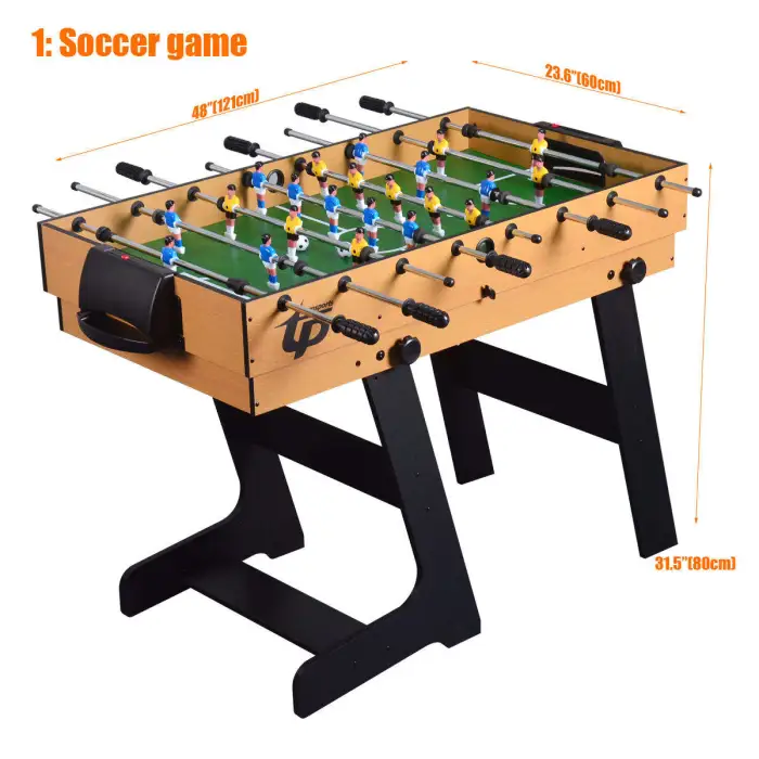 The table supports five games: billiards, shuffleboard, ping-pong, bowling, and football.