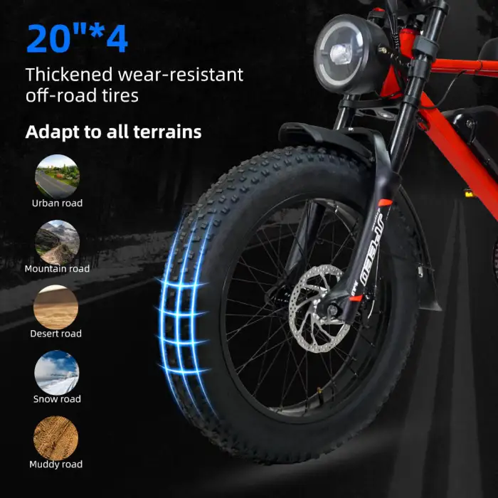 The e-bike is equipped with 20-inch tires that are 4.0 inches wide.