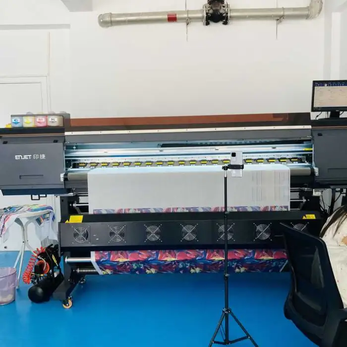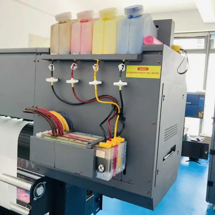 This printer uses sublimation ink, specifically designed to produce vibrant colors on various fabrics.