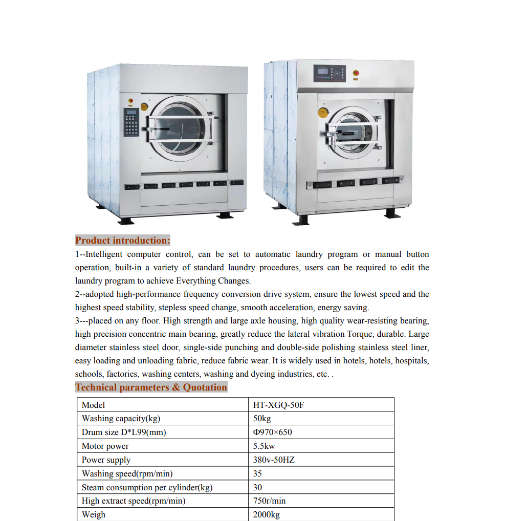 The machine has a capacity of 50kg, making it suitable for handling heavy laundry loads in commercial settings.