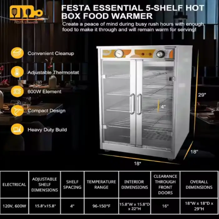 The 5-Shelf Electric Catering Hot Box is made of durable stainless steel, ensuring long-lasting use and easy cleaning.