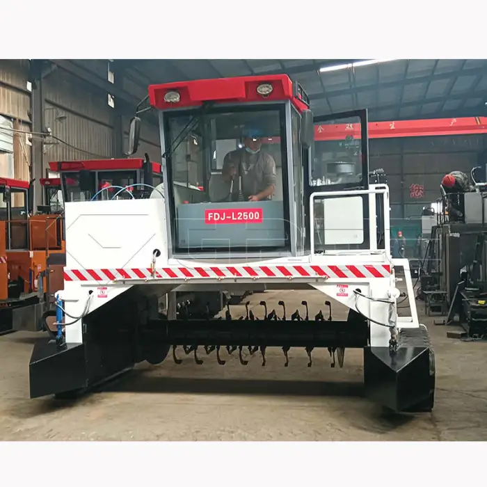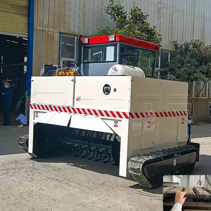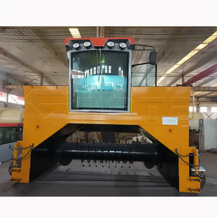 The machine is used for turning and mixing organic compost, processing organic waste and manure, improving compost quality for agricultural use, and efficiently managing municipal solid waste (MSW).