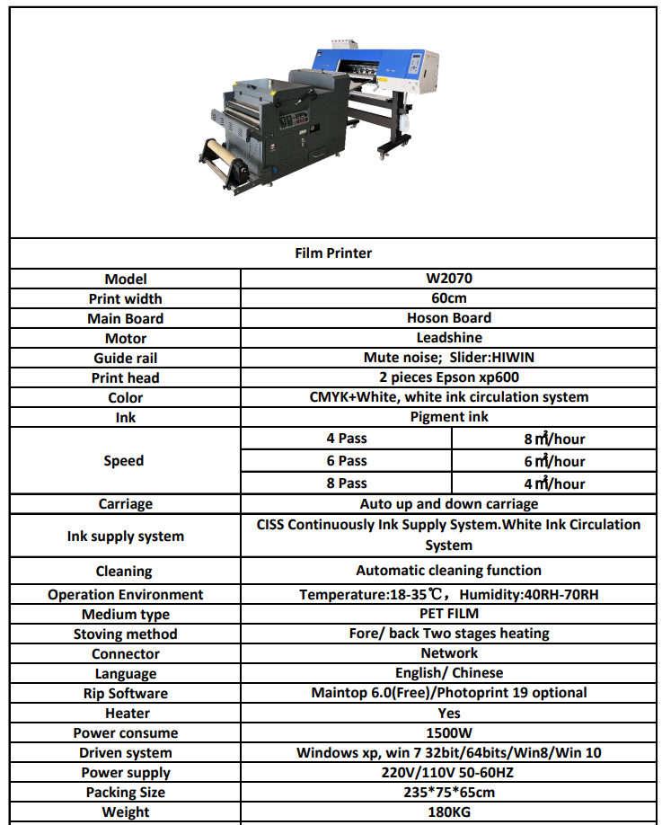 The printer is compatible with various design software, including Adobe Illustrator, CorelDRAW, and specialized RIP software for DTF printing.