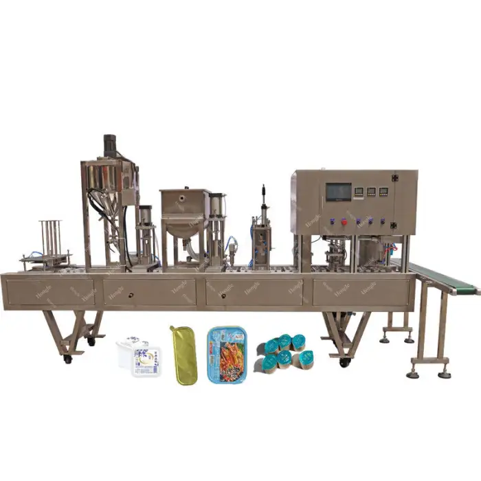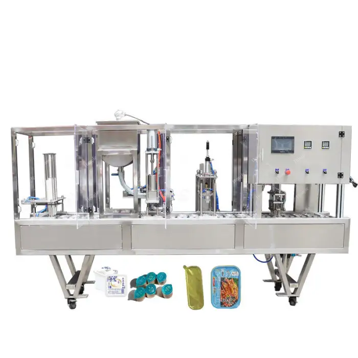 The machine performs automatic sealing to securely package the filled cups, preventing leaks and maintaining freshness.