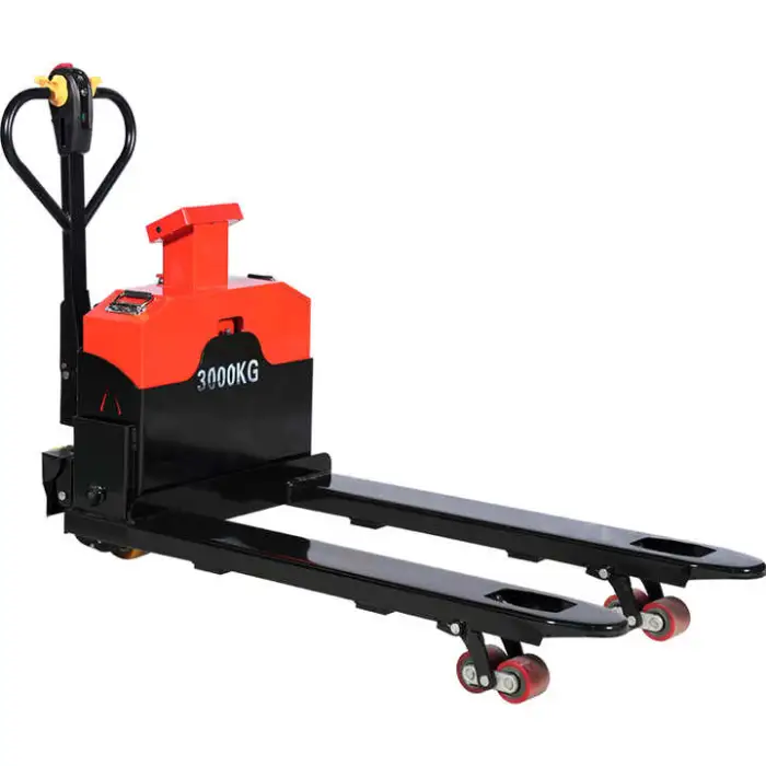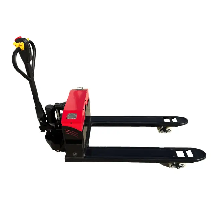 The pallet jack is powered by a 48V/20A electric hydraulic system, ensuring efficient operation.