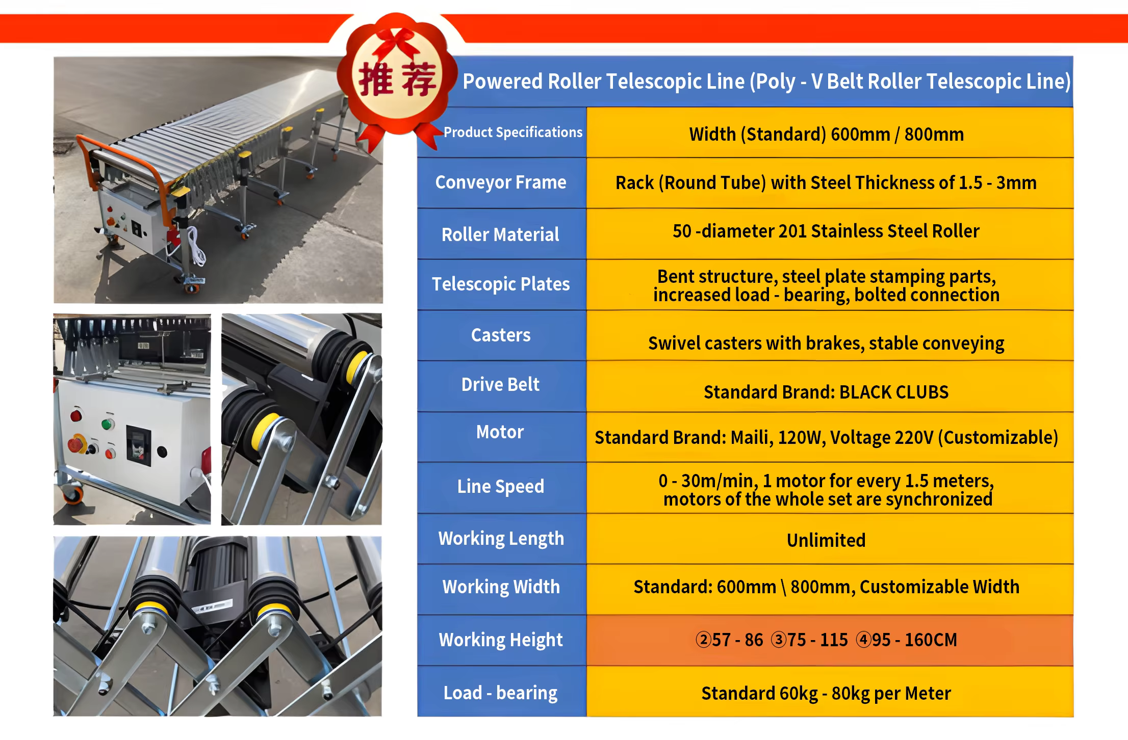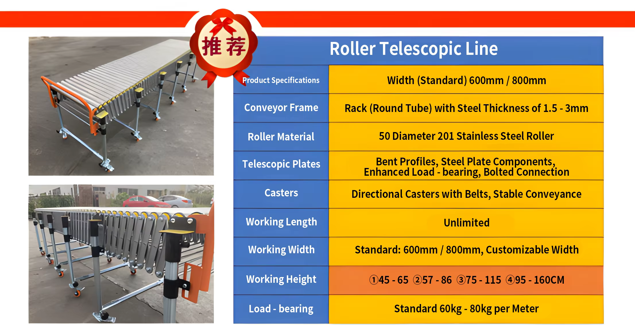 The conveyor offers automated operation for increased productivity, a telescopic design for flexible usage, and customizable dimensions.