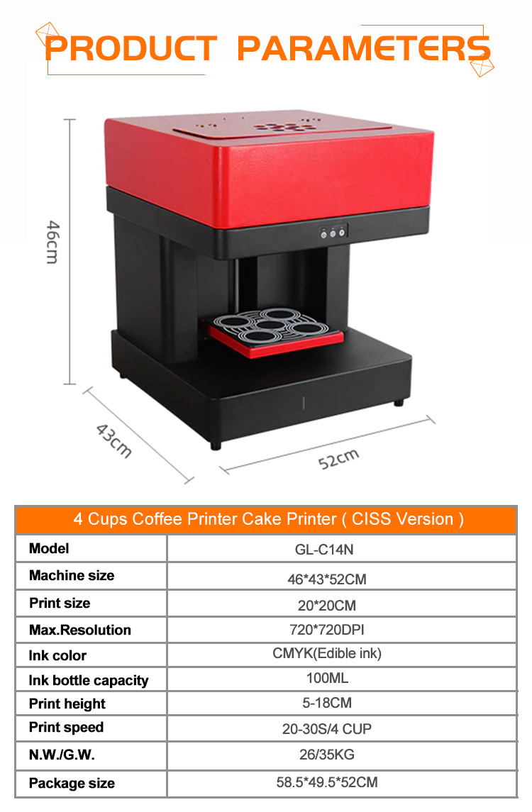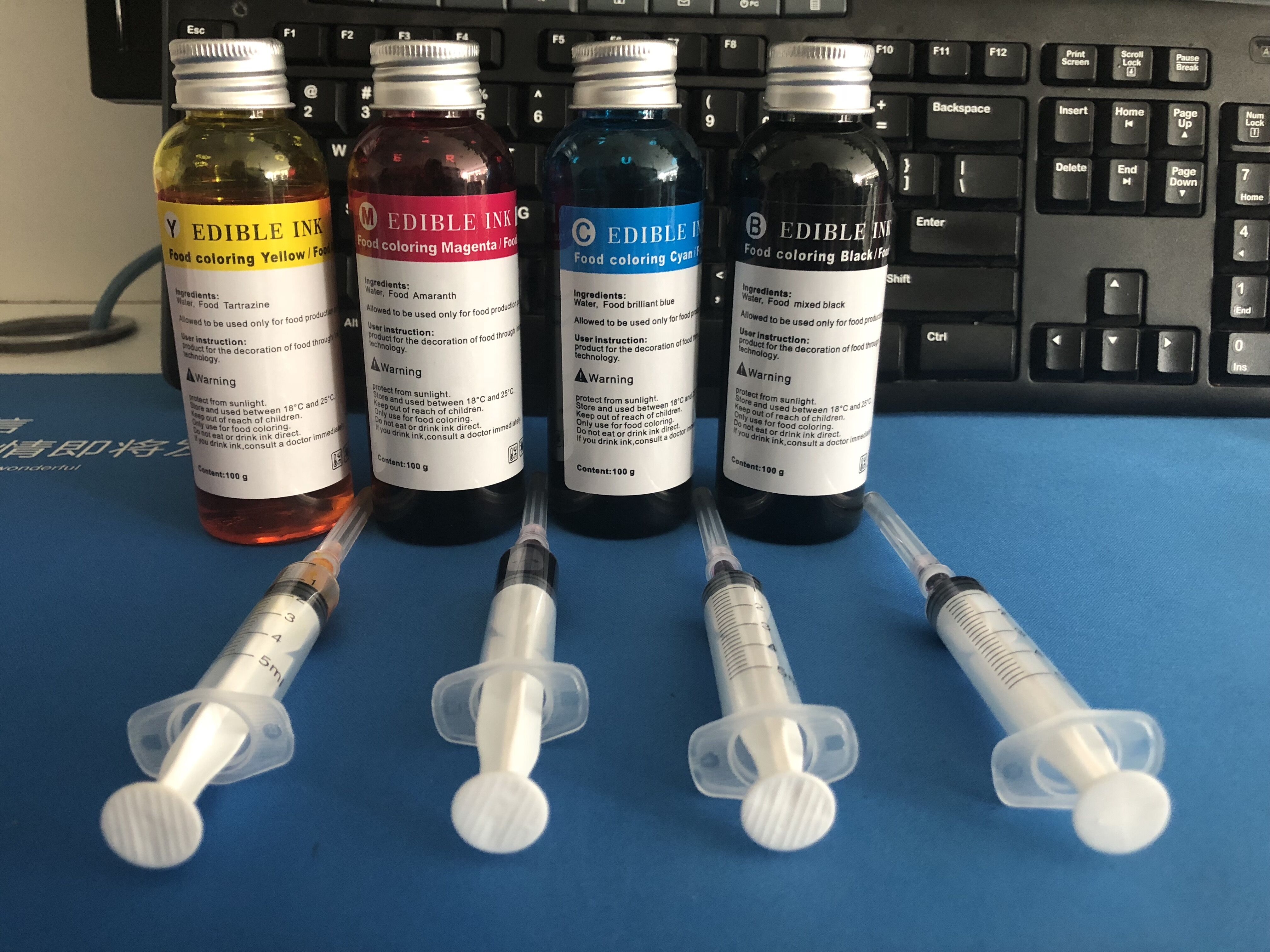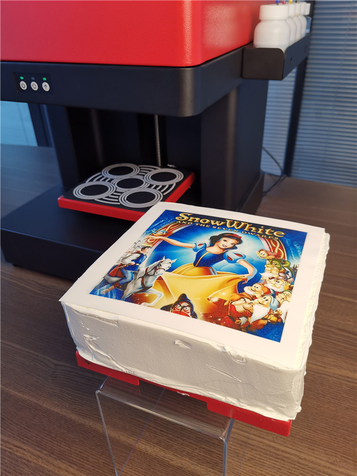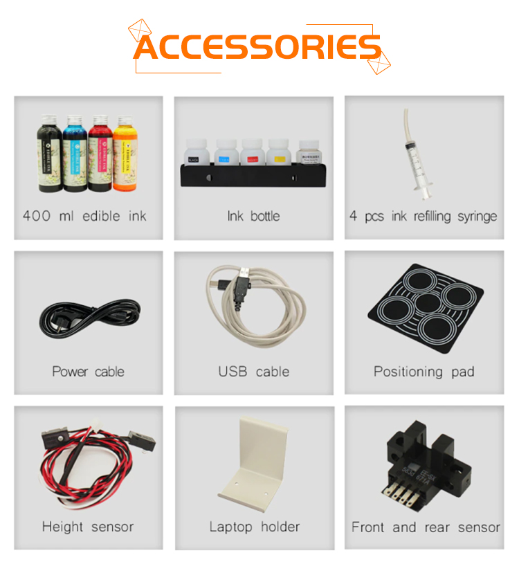 The printer comes with one set of CMYK edible ink, with each bottle containing 100 ml. This ink is pure natural and free from additives.