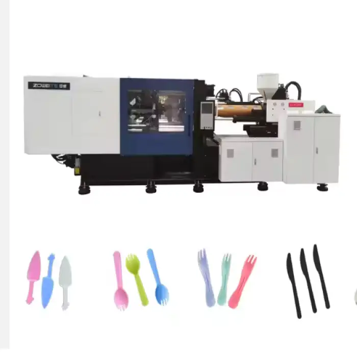 The machine utilizes hydraulic injection molding technology for high-speed and precise production of plastic cutlery.