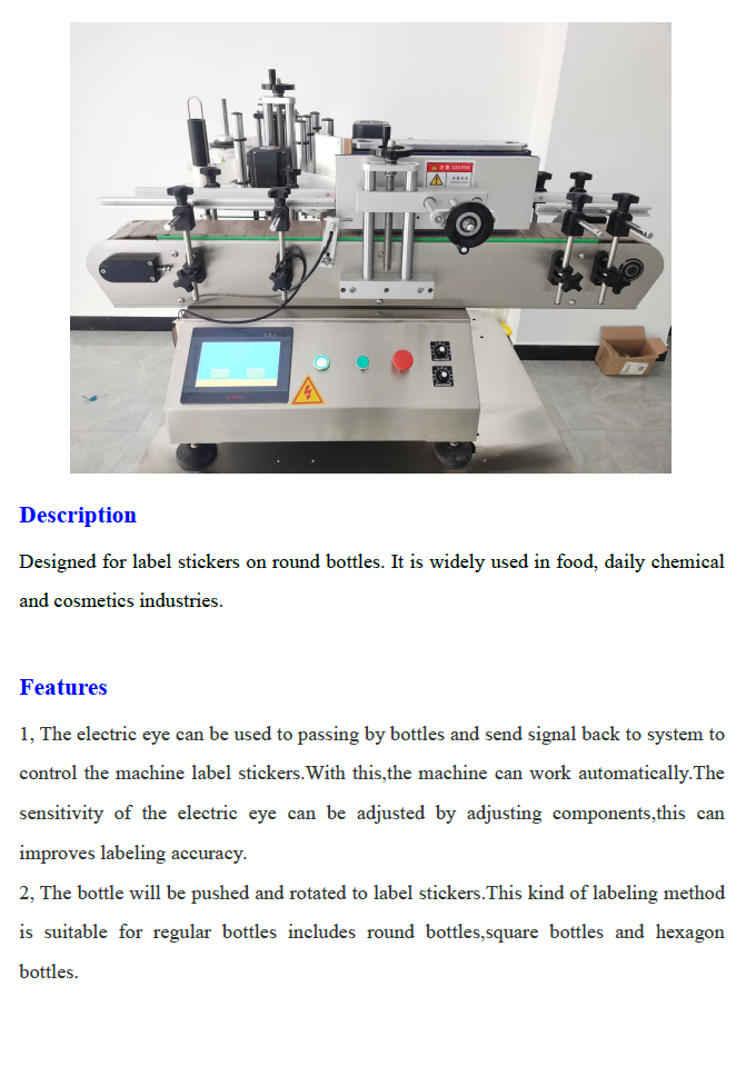 The automatic desktop round bottle labeling machine is designed to work with various sizes of round bottles, ensuring efficient labeling for most standard bottle shapes.