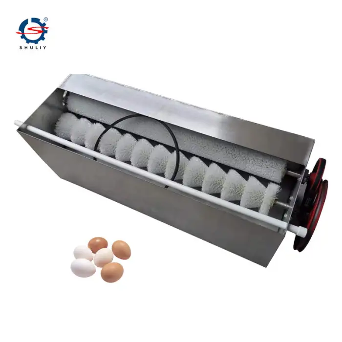 The egg washing machine helps maintain hygiene standards in egg handling by thoroughly cleaning the eggs during processing.